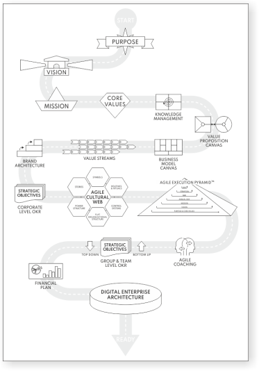 Digital Readiness Framework is a practical business architecture framework for enhanced strategic alignment, agility and motivation in the digital era. There are 31 different building blocks and 14 practices presented. Their interconnection and interdependence, how they fit together as an integrative and holistic system is what makes the concept of digital readiness unique.